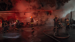 消防救援人员赶到后,利用两支水枪的大水流扑救着火的电动自行车,几分钟后,大火被扑灭。