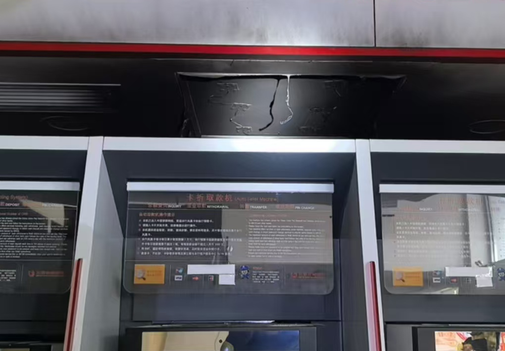经消防救援站到场核实,现场为ATM机上方的方形照明灯起火,起火原因为电气线路故障所致。