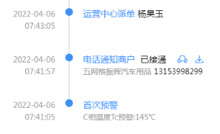 接收到此预警后,中心值守人员立即拨打此商户电话,通知该商户业主,告知商户线缆温度异常过高,具有重大安全隐患,请其立刻停止大功率用电器并断电,并让该业主立刻通知电工前往处置,随即派单中心巡检人员,让其立刻前往现场复核处置该预警。