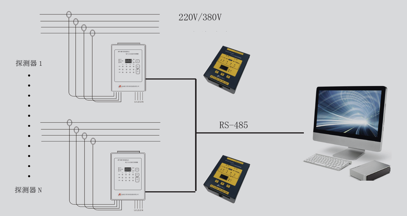 ■ 一台探测器可同时监测四条线缆,多台探测器与监控设备构成完整的电气火灾监控系统
