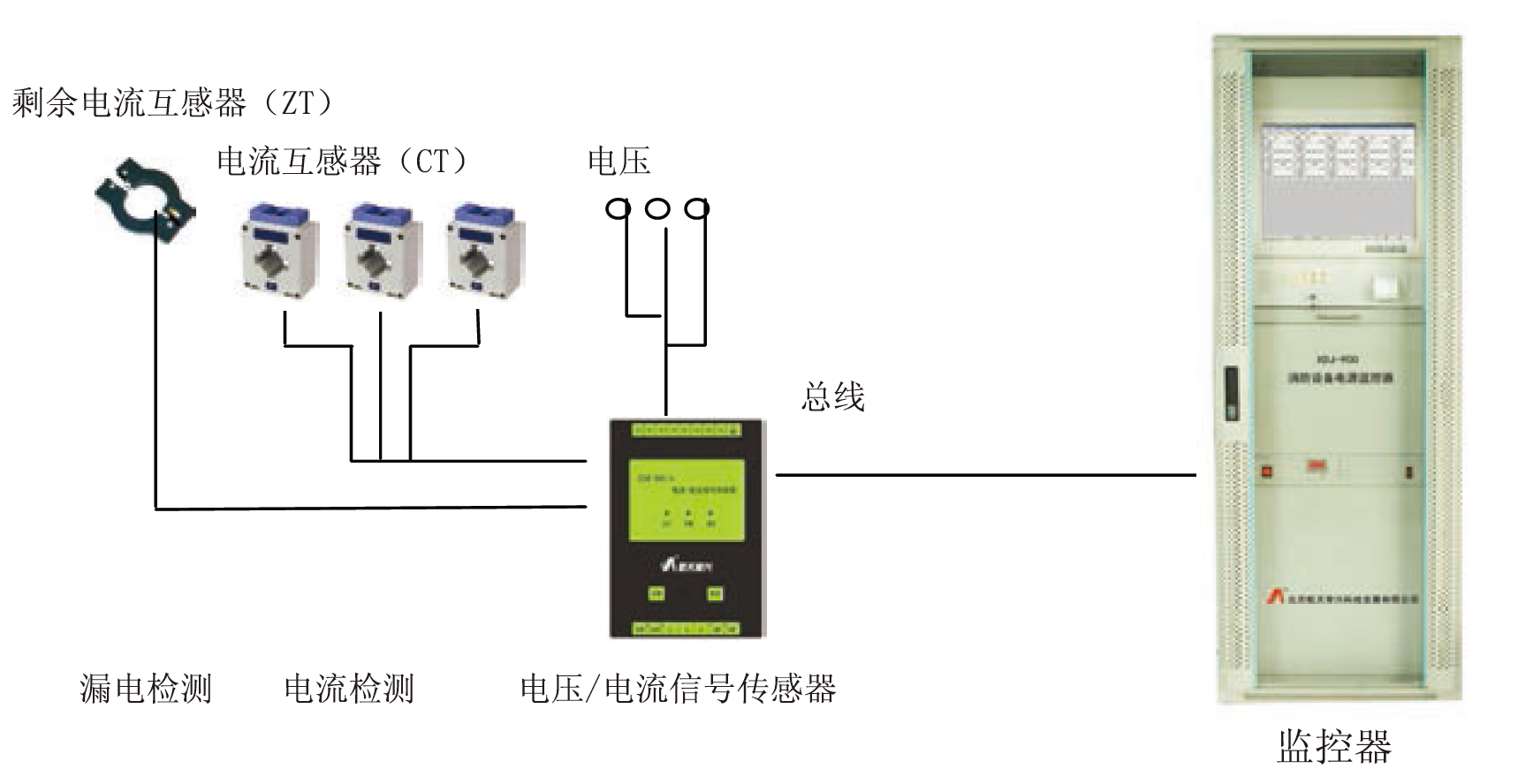 消防设备电源电压/电流信号传感器安装于配电盘或配电柜内,监控器安装于值班室。