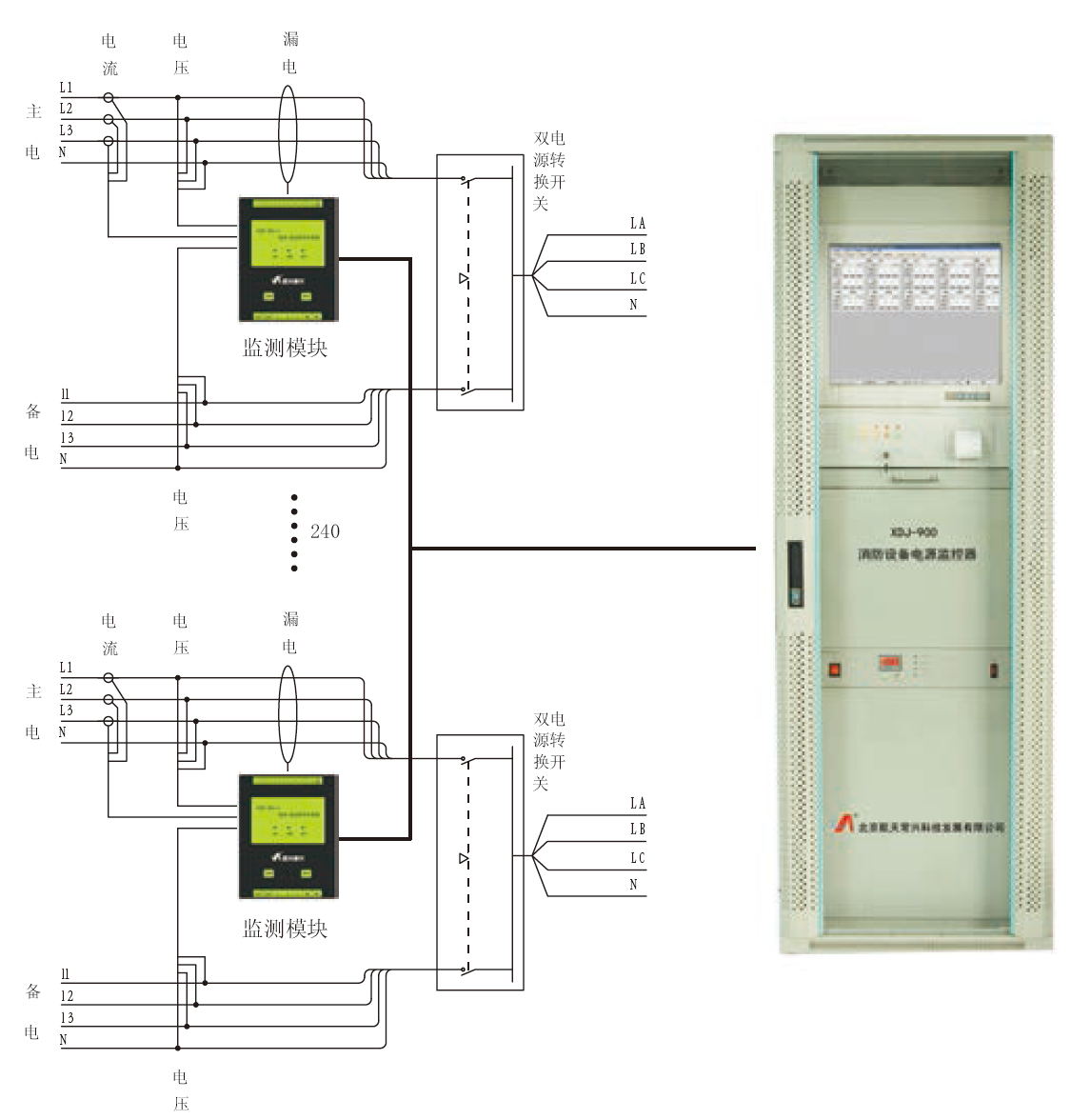 监测模块分别安装于配电盘、箱处,监控器可与480只监测模块相连接,同时监测480路消防配电线路,监控系统的连接如下图所示: