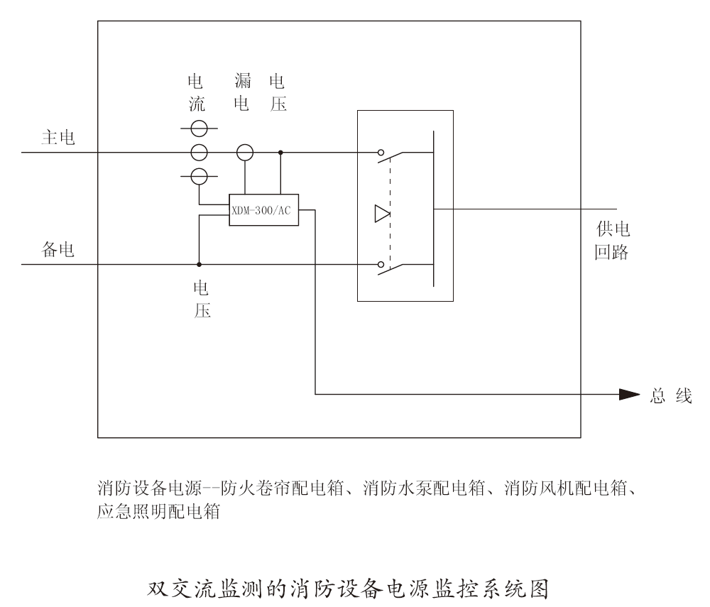 消防设备电源监控系统用于一般工业与民用建筑中AC220V/380V配电线路中安装的消防设备电源的在线监控,当消防设备电源发生过压、欠压、过流、漏电、缺相等故障时监控系统能立即发出报警信号,可及早发现问题从而避免各种事故的发生。